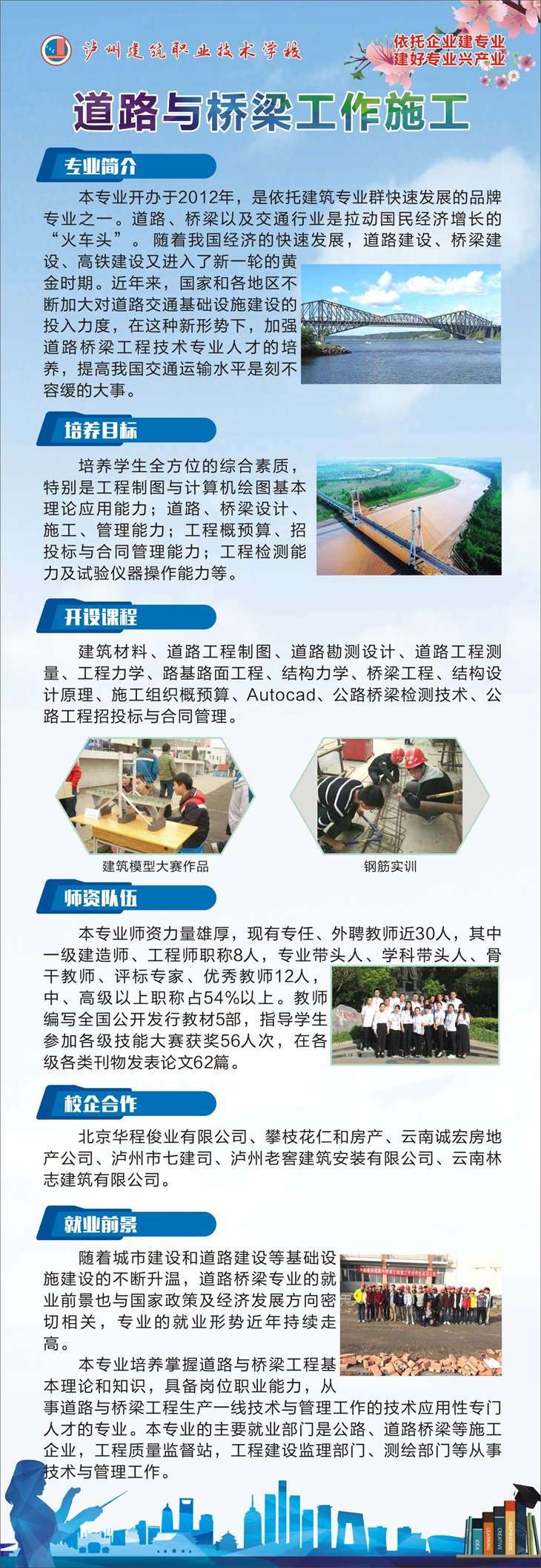 培養目標:主要面向道路和橋梁工程施工、管理、監理等企事業單位,培養在生產服務第一線協助進行道路與橋梁施工技術管理、施工生產管理、建設工程監理等工作,具有公民基本素養和職業生涯發展基礎的中等應用型技能人才。