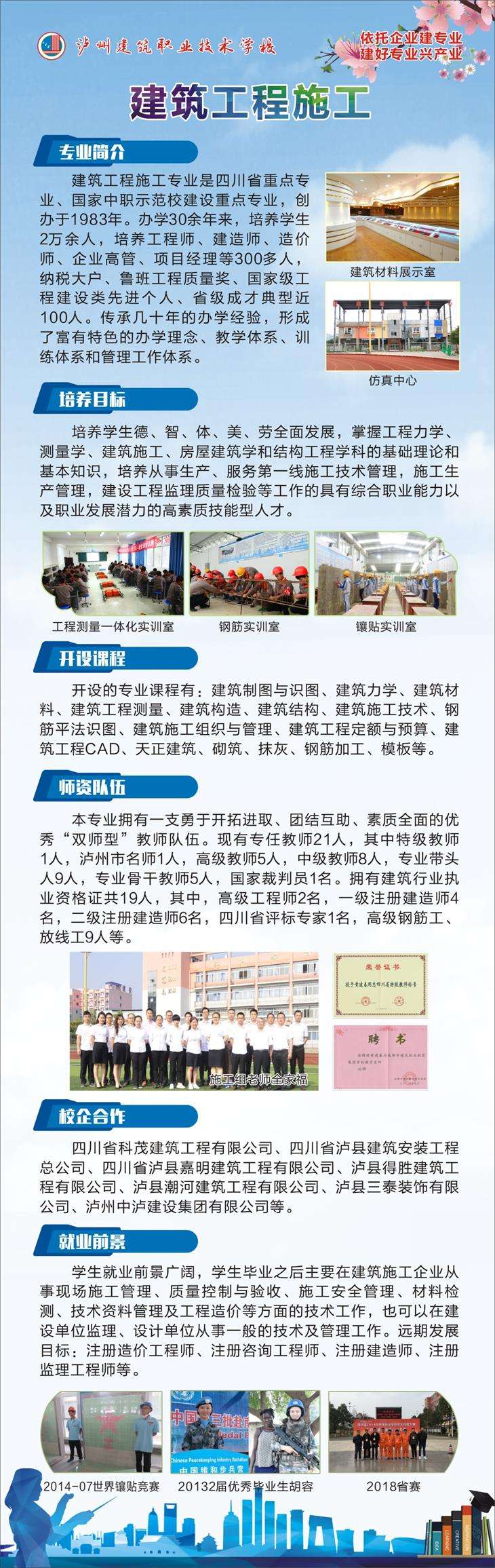 畢業生主要面向建筑施工、建設監理、建設工程技術咨詢等企事業單位,從事建筑工程的施工操作和基層技術管理等項工作,培養在生產一線的高素質勞動者和中初級專門型人才,能勝任施工員、測量員、質檢員、安全員、造價員、CAD制圖員、資料員等崗位工作。