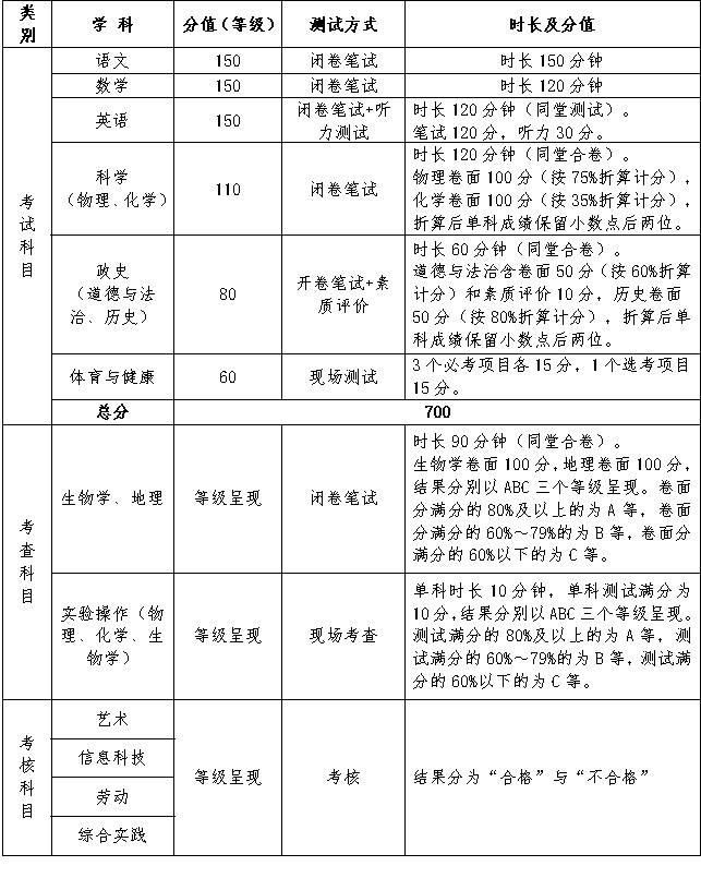綿陽這份關于中考改革的征求意見稿,中考計分科目取消了生物、地理、實驗操作,降低了物理、化學、體育的總分,中考總分從900分降為700分,高中招生錄取的科目只有:語文、數學、英語、政史、科學、體育與健康。