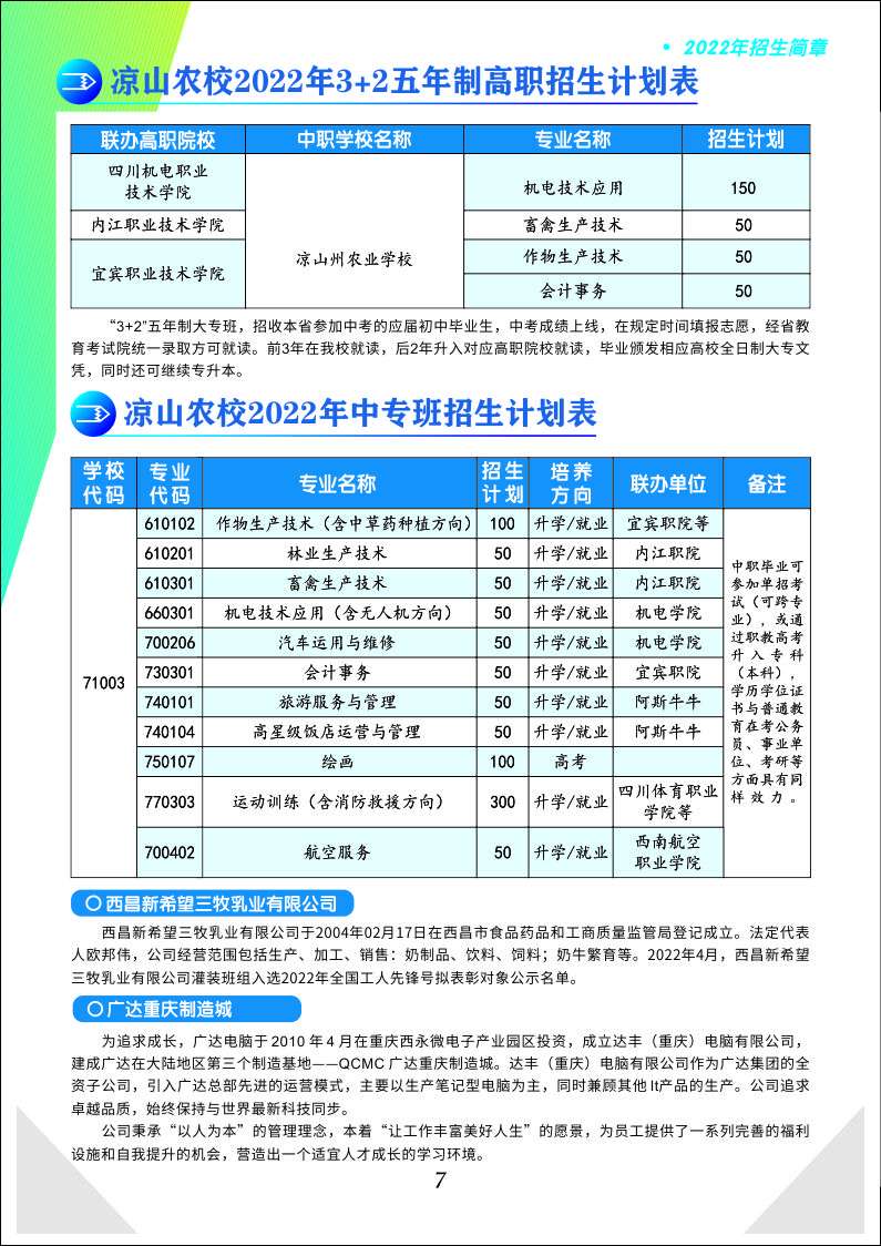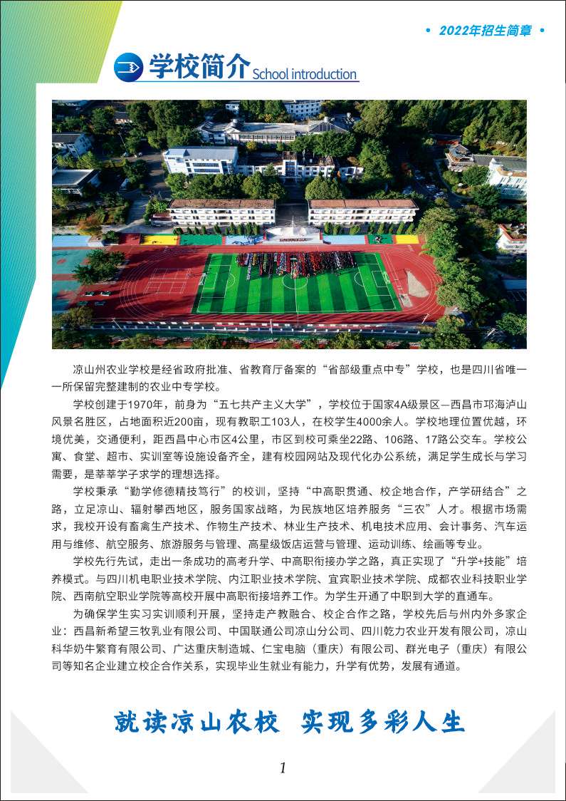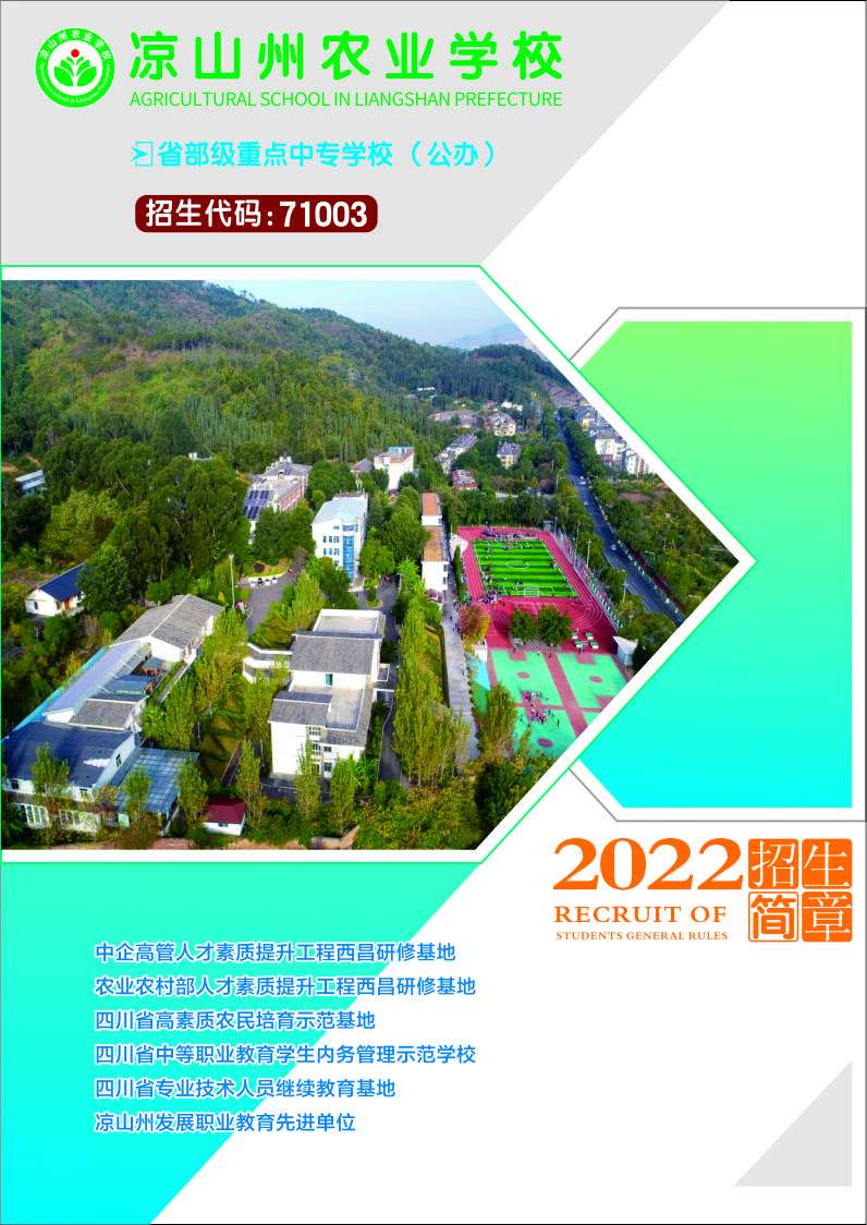 涼山州農業學校是涼山州人民政府國有公辦的中等職業學校,經四川省人民政府確認為省部級重點中等職業學校。學校創建于1970年,前身是“涼山五七共大六連”,1978年單獨建制后更名為涼山農業學校,于1992從昭覺縣遷至現址西昌市海濱中路16號,地處瀘山---邛海國家4A級風景名勝區,背靠瀘山、面向邛海。學校經農業農村部確定為“全國新型職業農民培育示范基地”,是中國企業聯合會、中國企業家協會“西昌研修基地”、國家行政學院西部教學點、教育部考試中心全國計算機等級考試涼山考點、國家職業技能鑒定站、四川省現代農業技術培訓基地、新型職業農民培育省級示范基地、四川省農村青年轉移就業培訓基地、川農大成人教育學院涼山分院、四川機電職業技術學院西昌教育中心、涼山基層干部和大學生村干部培訓中心、州水電移民培訓基地、州勞務培訓基地等。