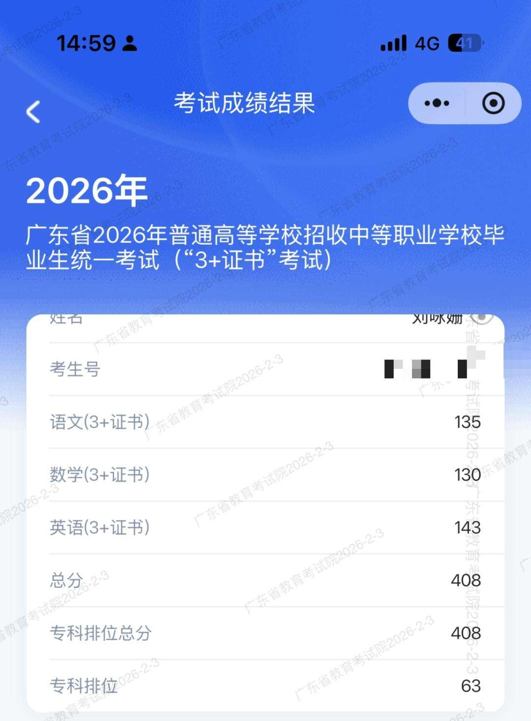 劉詠姍的“3+證書”考試成績(jī)截圖