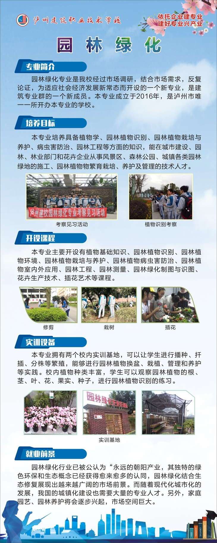 園林綠化專業培養目標:培養德、智、體、美全面發展,政治信念堅定,基礎扎實,知識面寬,專業素質高,實踐能力強,具備風景園林規劃設計、城市規劃與設計、風景名勝區和各類城市綠地的規劃設計等方面的知識,能在城市建設、園林等部門從事規劃設計、施工和管理的應用型人才。