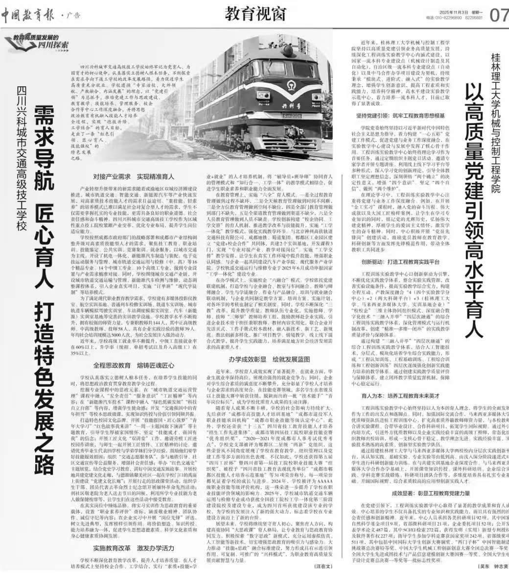 近日,國家級權威教育媒體《中國教育報》以專題大版面篇幅,對四川興科城市交通高級技工學校展開深度報道。這份重量級別媒體的關注,不僅將這所深耕技能教育領域、全力助力學子成長成才的優質院校,推向了全國教育視野的聚光燈下,更讓其多年來在技能人才培養賽道上的堅守與突破,被更多教育同仁、學生及家長所看見。
