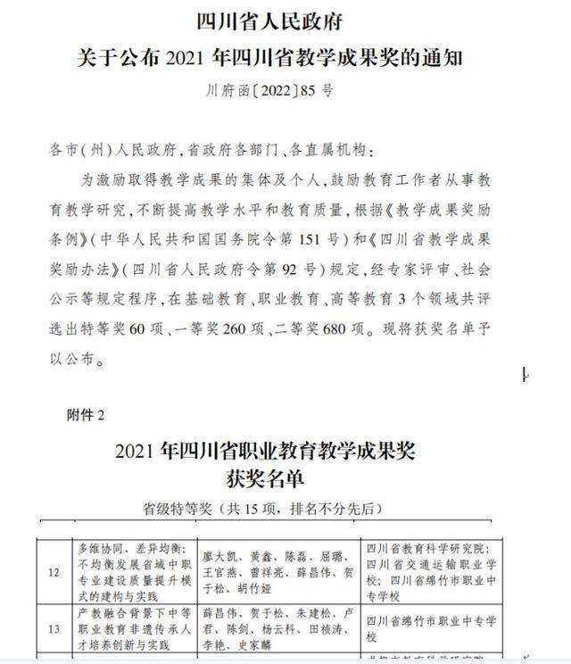 在四川省人民政府關于公布 2021 年四川省教學成果獎的通知( 川府函〔 2022〕85號文件 )中,四川省綿竹市職業中專學校收獲喜訊,成為四川省唯一獲得兩項教學成果特等獎的中職學校。