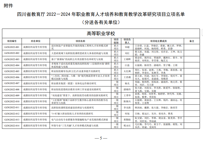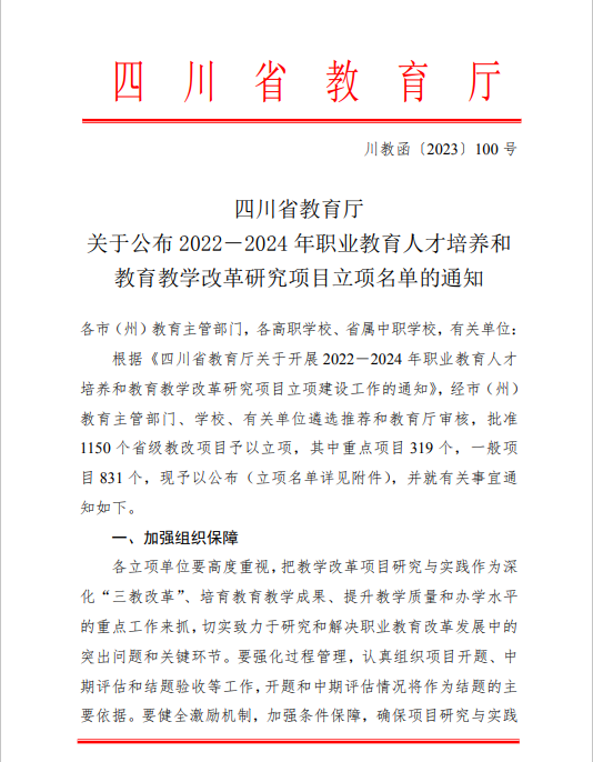 近日,四川省教育廳發(fā)布《四川省教育廳關(guān)于公布2022-2024 年職業(yè)教育人才培養(yǎng)和教育教學(xué)改革研究項(xiàng)目立項(xiàng)名單的通知》(川教函【2023】100號(hào)),我校兩個(gè)項(xiàng)目均成功立項(xiàng)。