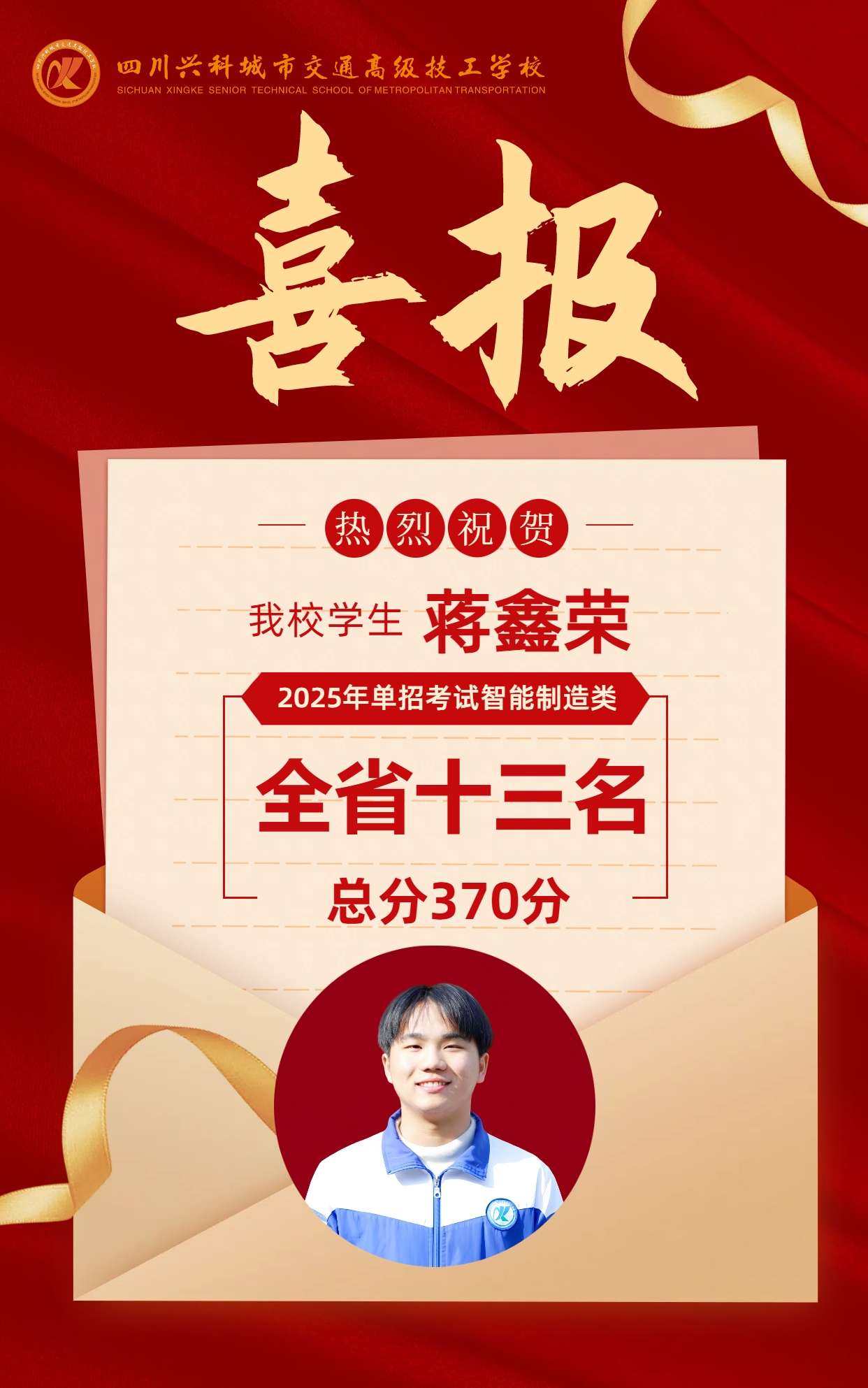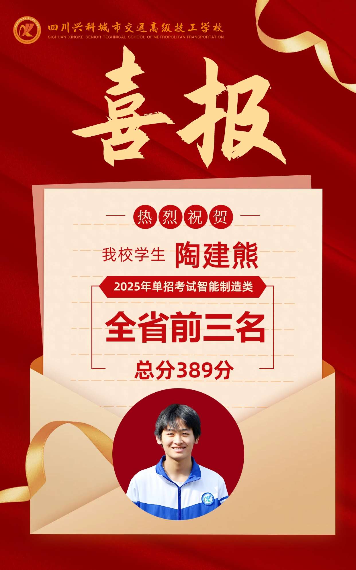 在2025年高職單招考試中,我校學(xué)子陶建熊以389分榮獲智能制造類全省前三名、唐亞東以379分榮獲智能制造類全省前五名、蔣鑫榮以370分榮獲智能制造類全省十三名、陳鑫以388分榮獲醫(yī)藥類全省十三名。